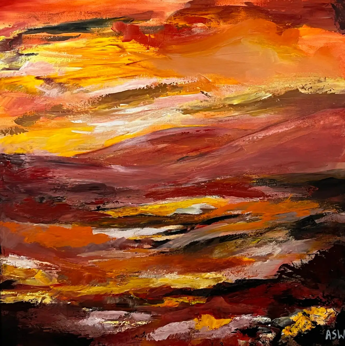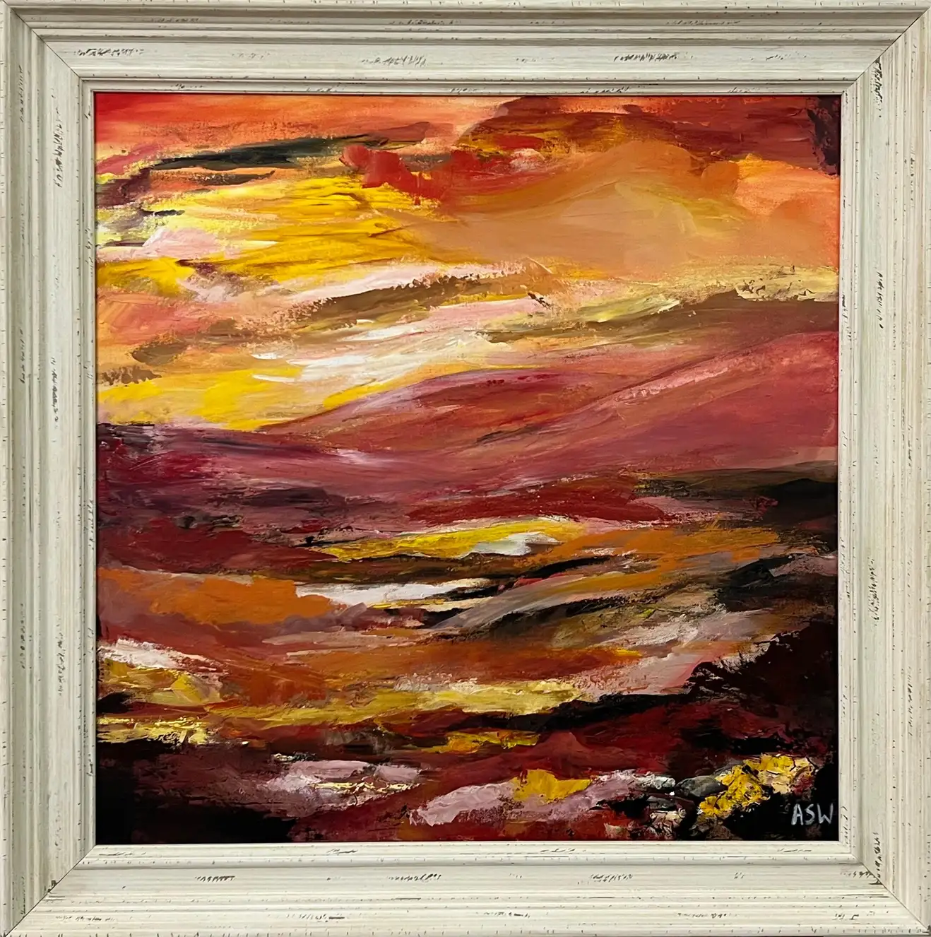 Warm Red & Yellow Abstract Landscape Painting by Leading Contemporary British Artist, Angela Wakefield. This atmospheric impressionistic depiction of a sunset over mountainous terrain forms part of a new body of work exploring human emotions.